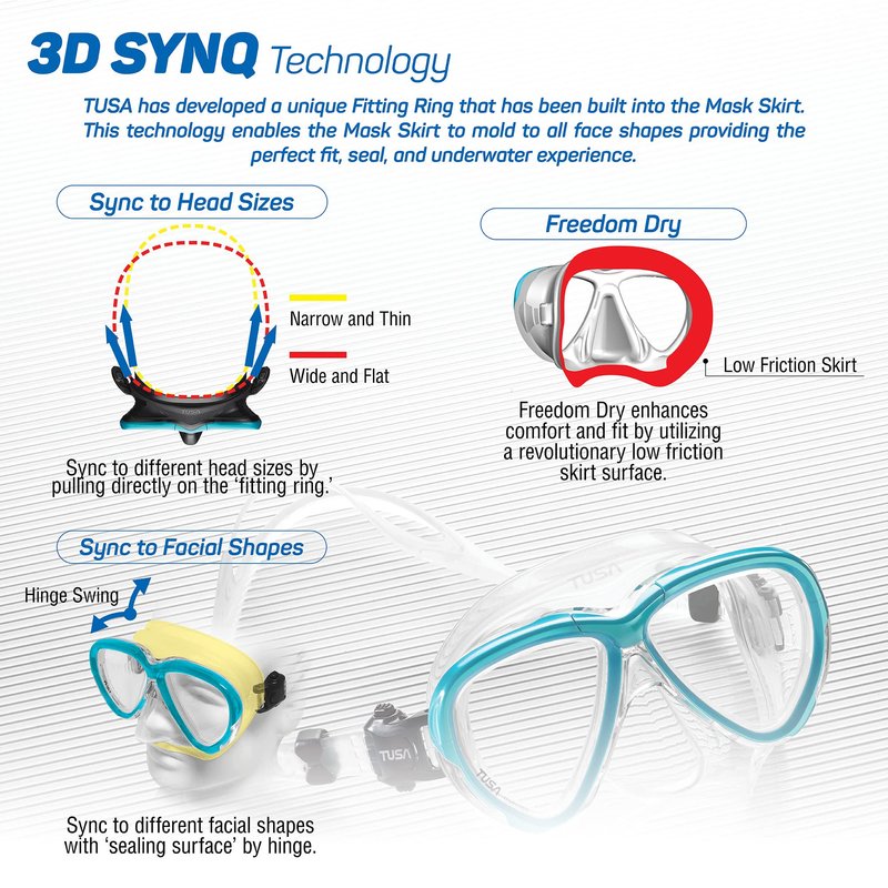 - 3D SYNQ - TUSA has developed a unique Fitting Ring that has been built into the Mask Skirt. This technology enables the Mask Skirt to mold to all face shapes providing the ideal fit, seal and underwater experience.