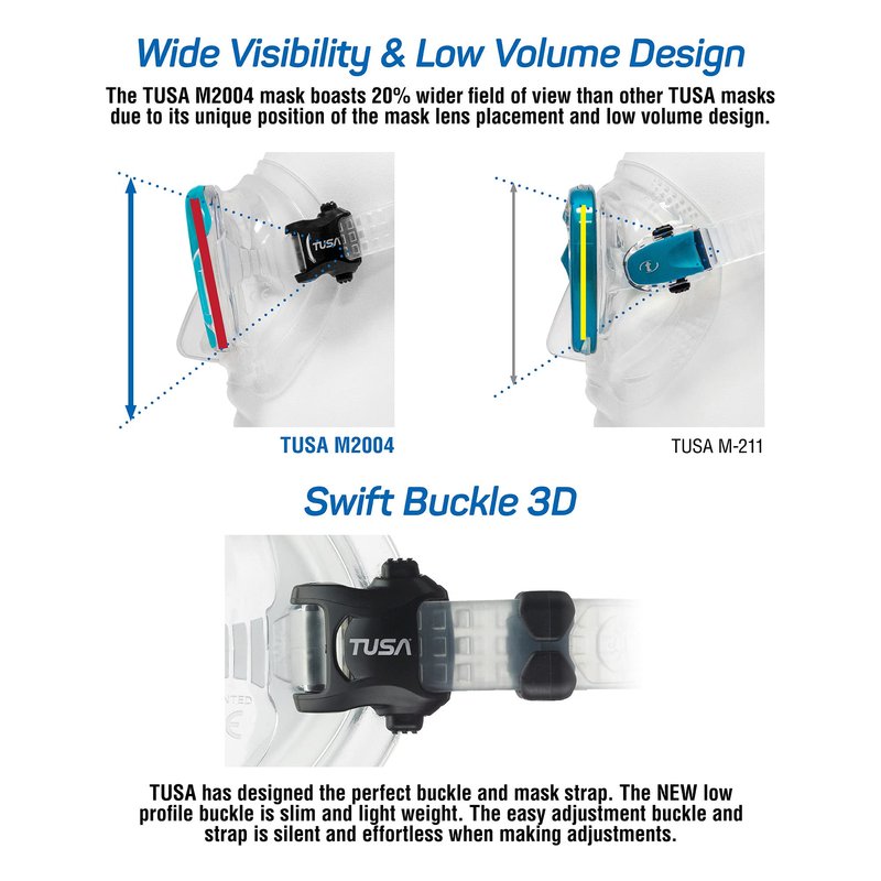 - SWIFT BUCKLE 3D - TUSA has designed the perfect buckle and mask strap. The NEW low profile buckle is slim and light weight. The easy adjustment buckle and strap is silent and effortless when making adjustments.
