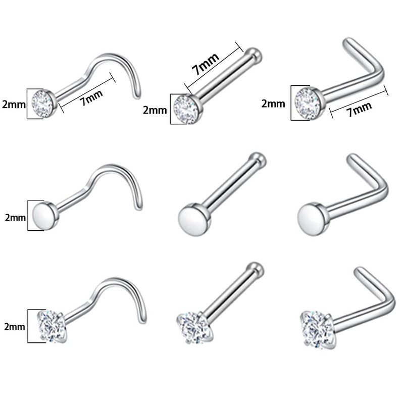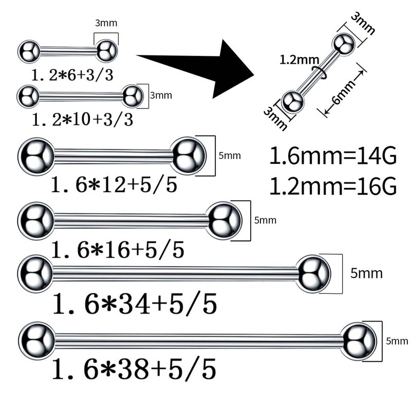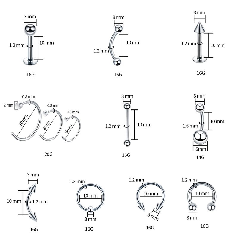 - Value Packages: (Note: Please wear gloves when unscrewing the ball/cone, otherwise the ball/cone may not be unscrewed!). 3pcs C shaped nose ring(20G); 3pcs belly button ring(14G); 9pcs nose screw studs(20G, S/L/pin shape); 3pcs labret barbell(16G); 3pcs labret stud spike(16G); 6pcs curved barbell ball spike(16G); 9pcs titanium industrial barbell(16G); 5pcs horseshoe nose ring(16G); 5pcs captive bead ring (16G); 5pcs spike horseshoe ring(16G);