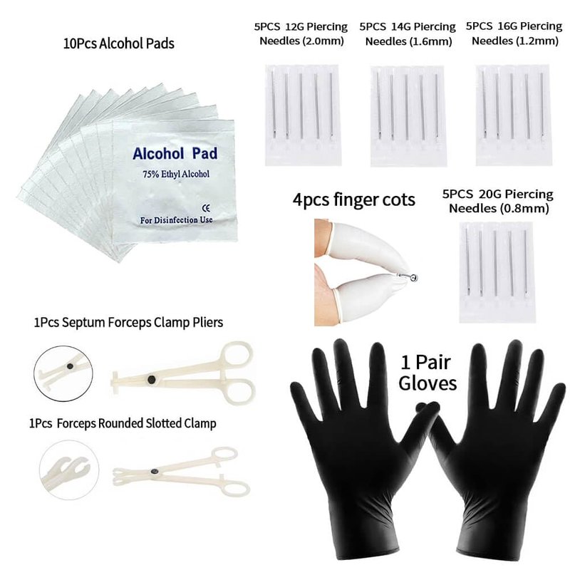 - Piercing Tools: 2pcs piercing clamps(1pcs septum forceps clamp pliers; 1pcs forceps rounded slotted clamp), 5pcs 12G piercing needles, 5pcs 14G piercing needles, 5pcs 16G piercing needles, 5pcs 20G piercing needles and one pair of black gloves, 10pcs alcohol pads. All items are sterilized using E.O. Gas.