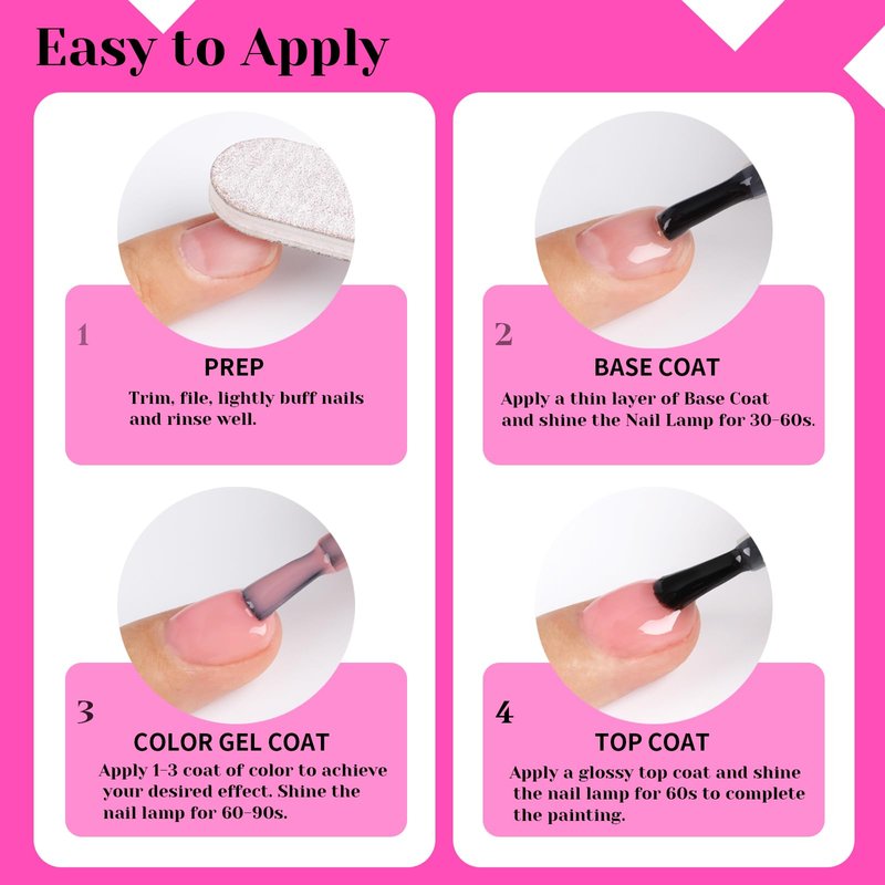 - 🎨Speed Curing with LED Nail Lamp: The gel nail polish kit need to be cured under LED Lamp. Base and Top coat required. Average for LED light 60-120 secs.