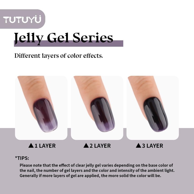 Introducing the TUTUYU Sheer midnaght purple Jelly Gel Nail Polish, the perfect addition to your nail care routine! This high-quality gel polish will give your nails a stunning, eye-catching look that's sure to turn heads. To use, simply apply your base coat as normal and let it dry. Then, choose your desired color of TUTUYU Jelly Gel Nail Polish and apply it thinly onto your nails.Finish off with a top coat and enjoy your long-lasting, salon-quality manicure! With the TUTUYU Jelly Gel Nail Polish, you can effortlessly achieve a high-end look in the comfort of your own home. Perfect for all occasions, be it a dinner party or just a day out with friends. Order yours today and step up your nail game!