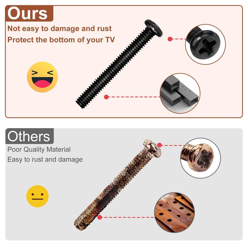 - With Anti-Rust Screws: Upgraded anti-rust screw kit offers unmatched protection for the bottom of your TV. Say goodbye to the worries of corrosion and rust, as these specially crafted screws ensure longevity and durability. You won't need to spend any extra time searching for screws, allowing you to spend more time enjoying your favorite shows.