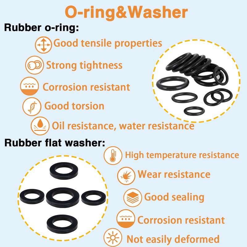 - {MULTI-STYLE}: 24 size plumbing washer rubber kit is made of high-quality nitrile rubber (NBR),with good sealing performance,high temperature resistance, corrosion resistance, water and oil resistance,not easy to deform and easy to use.