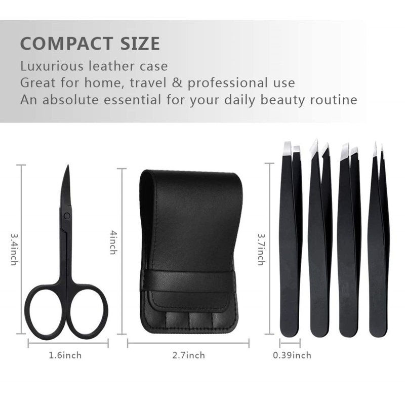 - HIGH QUALITY - This is made up of four different functional eyebrow tweezers and a pair of scissors combined in a fine travel leather holster.The travel holster is very lightweight for everyday carry, and the Velcro closure ensures that tweezers won't fall out of the bag and cause puncture wounds.