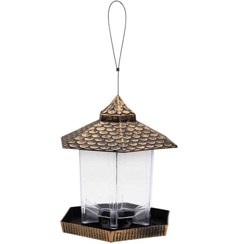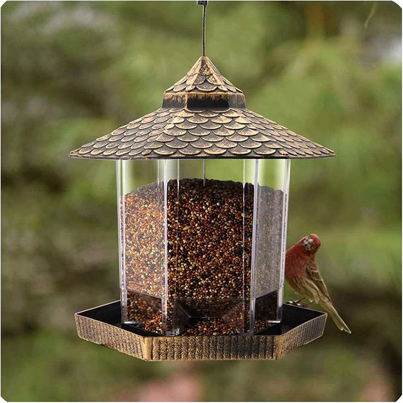 - CONSIDERATE DESIGN - Comes fully assembled and ready to hang. With its hexagon shape, the bird feeder for outdoors features an inclined roof to shade birds from the sun and rain. When the seeds are eaten, more seeds will naturally fill the tray.