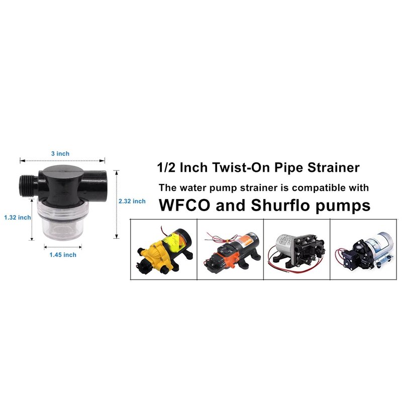 - [Water Pump Filter Specification]: 80 Mesh Stainless Steel Screen, Twist-on Water Pump Strainer, 1/2 Inch Npsm Inlet, 1/2 Inch Npsm Outlet,Compatible With Shurflo Or Wfco,15-085-00.If you think there is something wrong with the product, please contact us first, and we will definitely help you solve the problem.