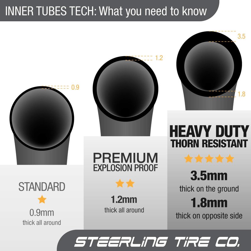 - CHOOSE PEACE OF MIND: We understand families have a lot to take care of and time should not be spent constantly changing tires. For this reason, we have made our inner tubes to last longer. Be aware that it will feel harder when changing the tire because its Extra 3.5x Thickness Material - This is meant to be and know that we work so you never have to replace a tire again! - Have Any Problem? Please Contact Us Anytime.