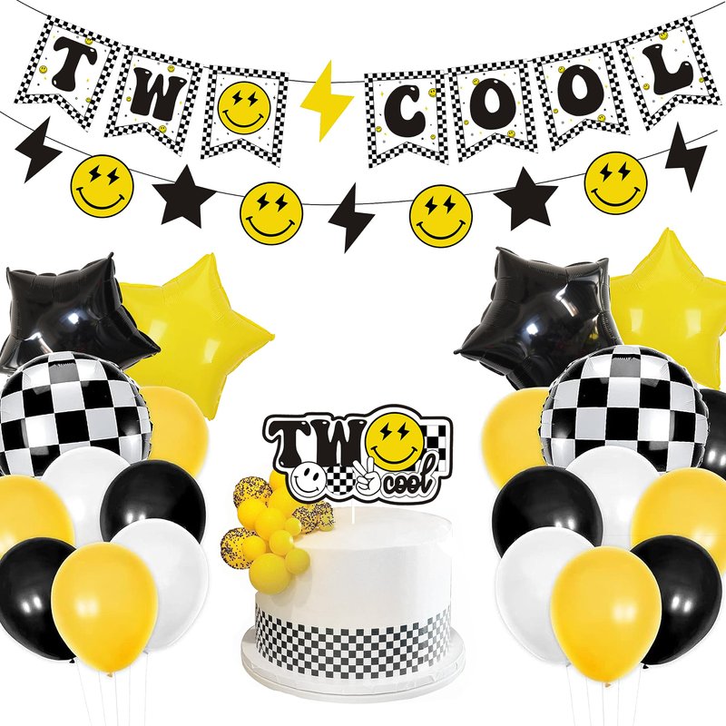 Two Cool Dude Birthday Party Decorations, Two Cool Second Birthday Banner Balloon Cake Topper for Two Year Old Happy Dude Yellow Black Lightening Checkered Party Decor