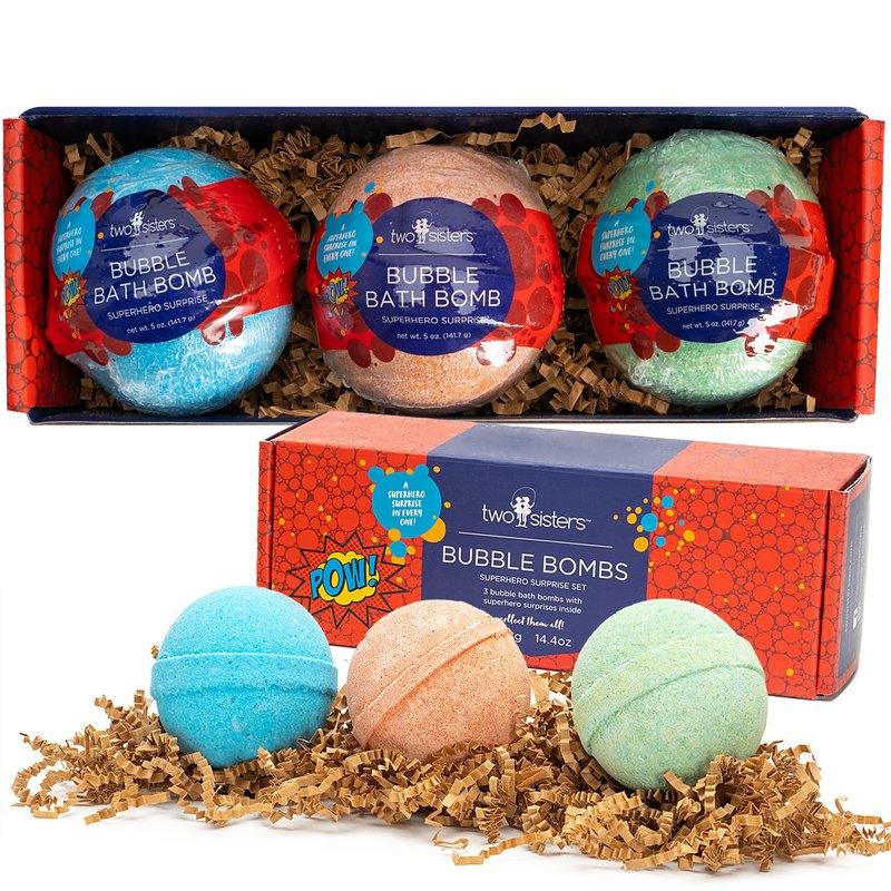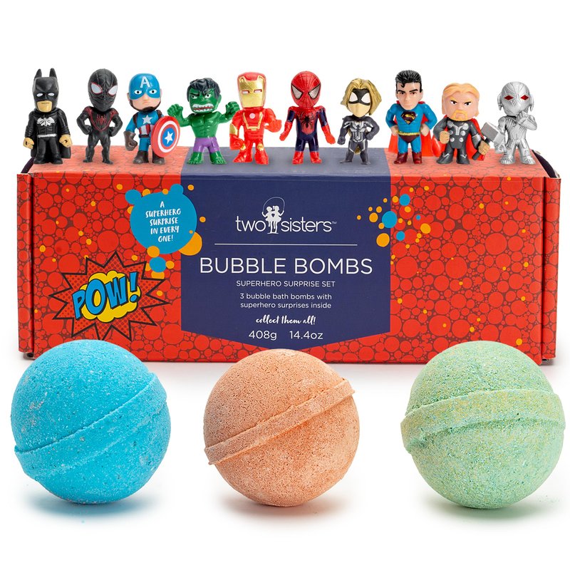 Two Sisters Spa Superhero Bath Bombs for Kids with Surprise Inside, 3 Kids Bath Bombs with Superhero Toys, Ideal Birthday Gift for Boys & Girls, Gentle and Kids Safe