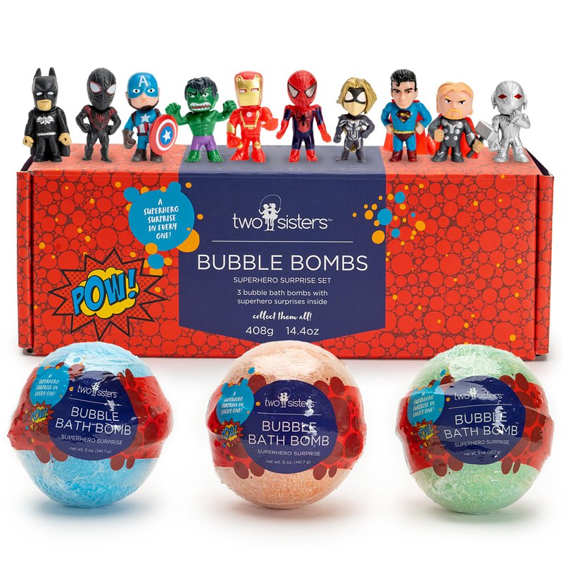 - Superhero bath bombs - Watch as the bath bomb fizzes and reveals fun toys inside.