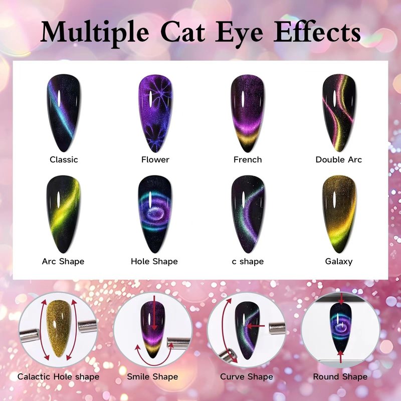 - 【Charming Effect of Cat Eye Gel Nail Polish】Chameleon color with cat eye effect and holographic shimmer with galaxy effect. Tips: Mix Our magnetic nail polish gel color, and you will get amazing results! Attractive color changing and cat eye effect will surprise you. Different effects depend on different lights and angles!
