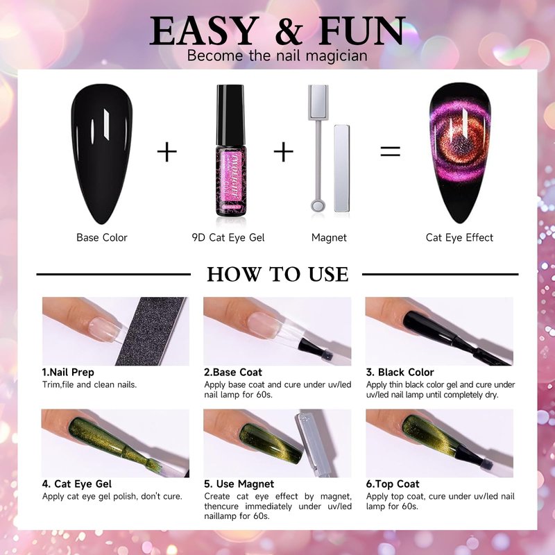 - 【Easy Application and Good Quality】With proper application, it can last at least 4 weeks. Easy to use, with good toughness and tinting strength. Brings you a brilliant shiny finish and a smooth appearance. The gorgeous 9D cat eye gel nail art set is perfect for all daily working or dating, vacations party, or ceremony activities.