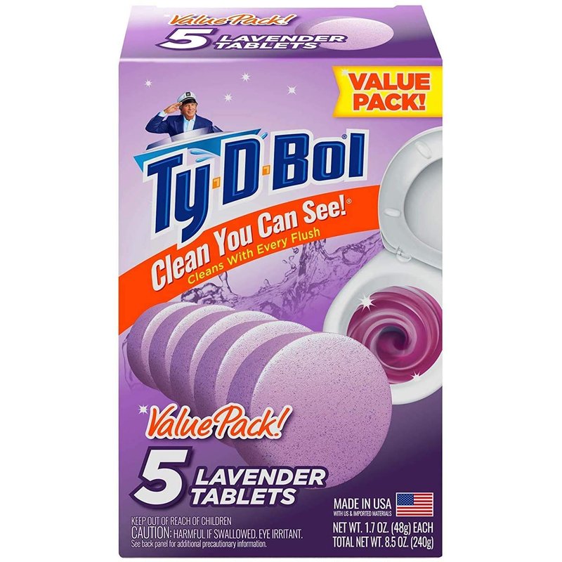 - CONTINUOUS Blue WATER with Fresh LAVENDER SCENTED Cleaning detergents that keep your bowl clean in between scrubbings, get a clean, odor-free toilet bowl with each flush; Ty-D-Bol toilet bowl tablets fight hard water stains, keeping the toilet bowl looking & smelling clean