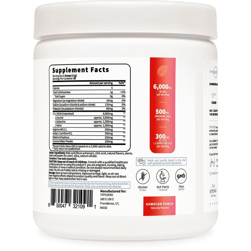 Type Zero Ultra Clean Vegan BCAA Powder + Electrolytes (Hawaiian Punch | 6G) 2:1:1 Sugar-Free/No Sucralose BCAAs Amino Acids Supplement for Women/Men - Best BCAA Vegan Amino Acids After Workout Drink