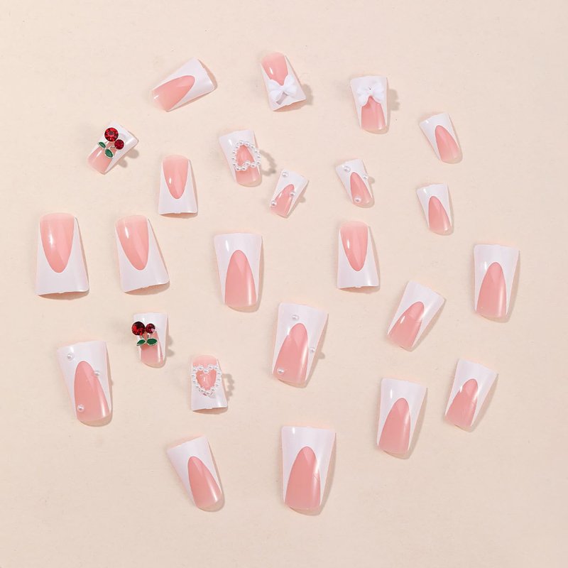 24Pcs Duck Press on Nails Medium False Nails, White French Tip Fake Nails With White Bow Pearls 3D Cherry Designs, Artificial Fingers,Party, Nail Salon, Holiday Nail Art Decorations