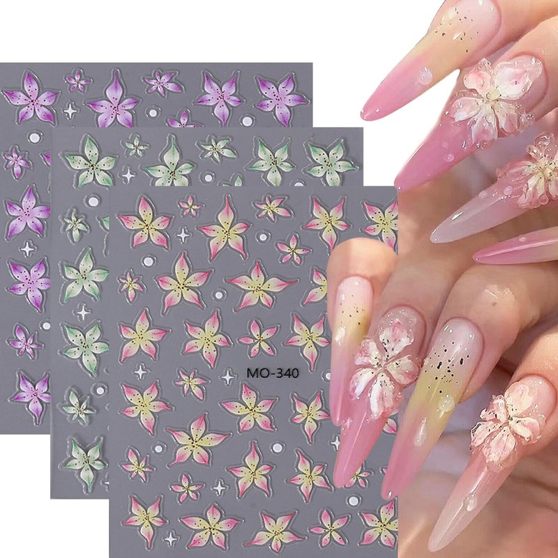 - 【Quantity】You will get 5 sheets 5d embossed nail art sticker (Include blue pink white green purple stickers for nail art ),enough for you for you to use and replace in daily life. to easily style your DIY manicure.