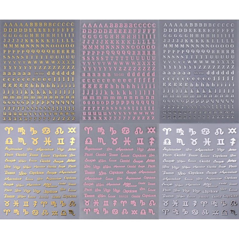Tyuimhx 6 Sheets Letter Nail Art Stickers Decals Zodiac Stickers for Nail Art 3D Self-Adhesive Gold Silver Pink Nail Stickers Alphabet A-Z Nail Decals Supplies for Women DIY Manicure Decorations