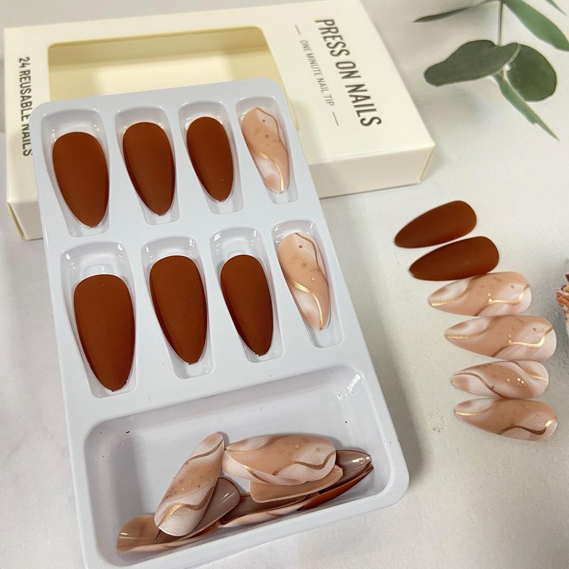- 【High-Quality Material】:Brown press on nails is made of high-quality ABS acrylic material. It is odorless,not easy to fade. It is harmless to your body and nails, and supplies you with a comfortable and wonderful experience.