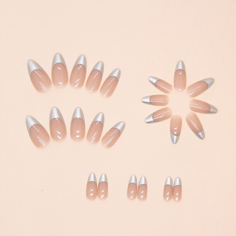 24Pcs Press on Finger Nails Almond medium False Nails, Silver Fake Nails, Artificial Fingers,Party, Nail Salon, Holiday Nail Art Decorations
