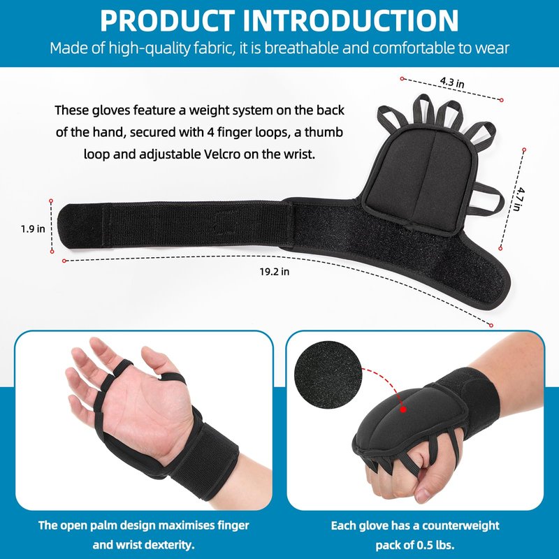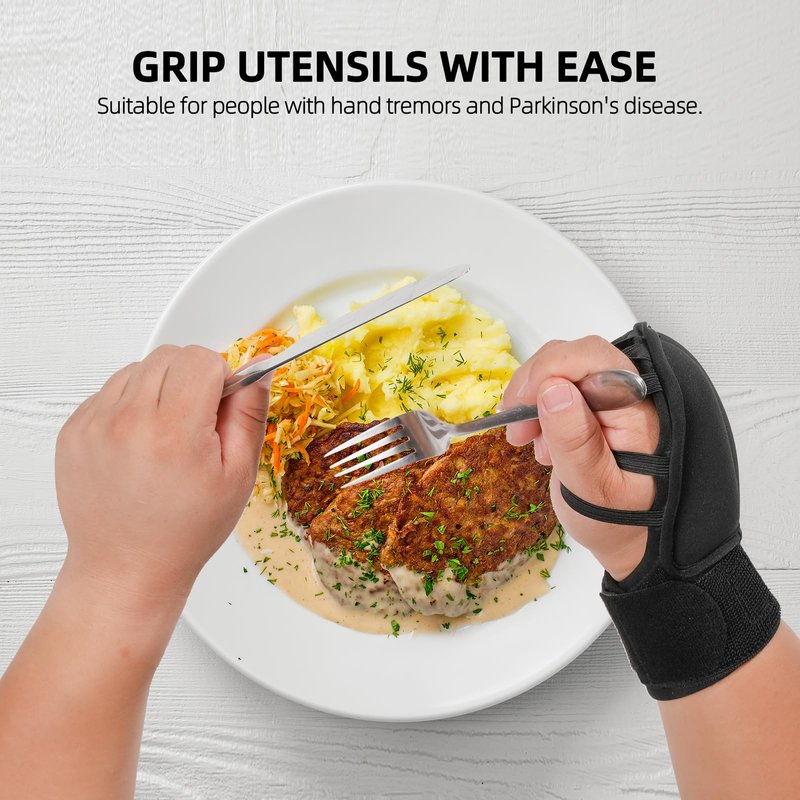 - STABLE, EASY GRIP: The 0.5lb glove offers stability and comfort for weak grip or wrist shake. It is an aids for hand tremors, arthritis, Parkinson's, or dexterity issues during eating or writing.