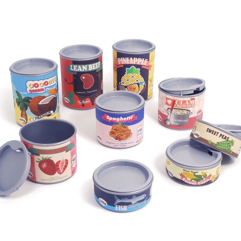 - The play food cans toy is fIntegrated molding, closer color of metal. lid is soft plastic, closer to opening mode of easy pull ring. Grocery canned printing is more delicate, the pattern is printed with various signs of real cans.