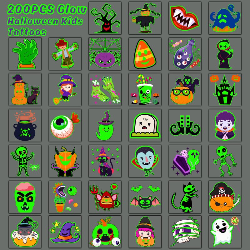- Halloween Party Favors: 200 sheets Halloween temporary tattoo stickers come in 40 styles, 5 of each. Glow in the dark that cool with the atmosphere of the Halloween and are ideal for Halloween.