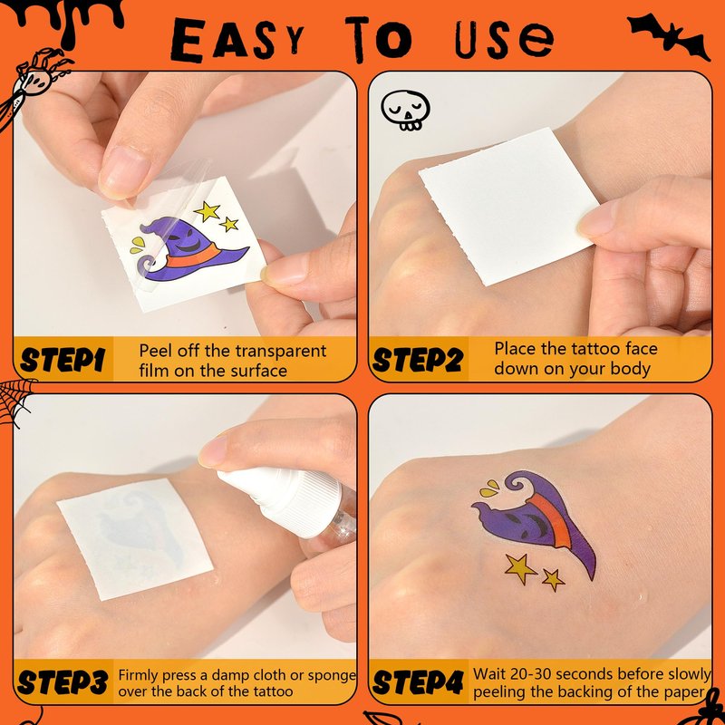- Halloween Treats for Kids: These Halloween tattoo stickers are easy to apply and allow you to feel the joy of Halloween. The Halloween tattoo stickers stay on for 5-7 days, giving you plenty of time to celebrate and enjoy the Halloween.