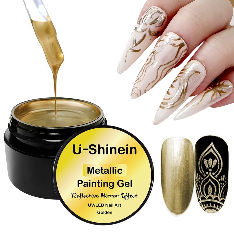 U-Shinein 8ml Metallic Painting Nail Polish Gel, Golden 3D Metal Painting Gel Drawing Mirror Nail Gel Polish, Nail Liner Painting Gel Glossy Soak Off UV/LED DIY Nail Manicure