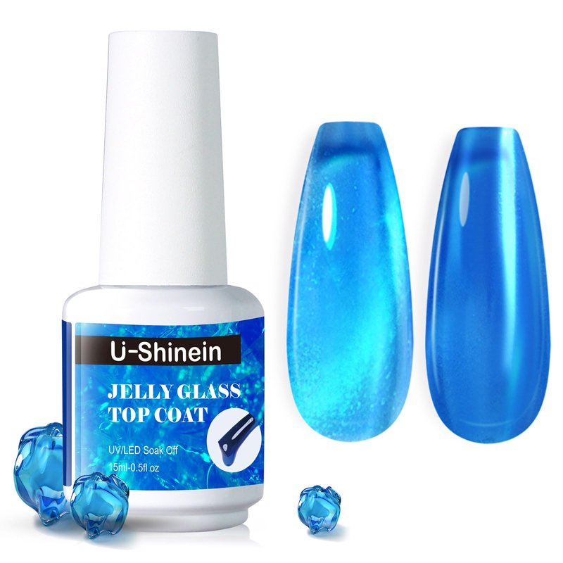 U-Shinein Jelly Gel Nail Polish, Top Coat Gel Nail Polish for Jelly Glass Finish, Sheer Blue Crystal Translucent Gel Nail Polish Jelly Glass Top Coat Gel Soak Off UV/LED for Nail Art Manicure Salon