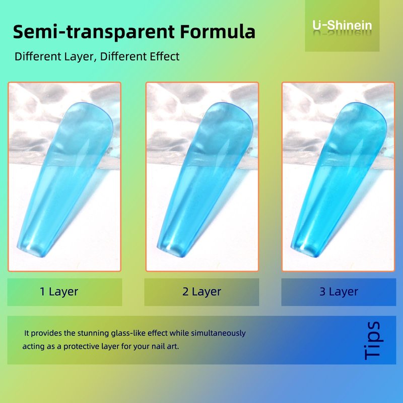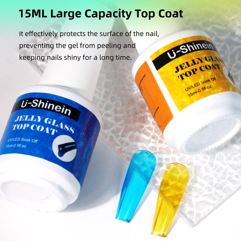 - 【Jelly Glass Top Coat Gel】Our jelly glass top coat sets itself apart from traditional jelly gel polishes by offering a stunning glass-like finish. The translucent formula provides a vibrant, reflective effect that mimics the appearance of colored glass. Prepare to be dazzled as your nails radiate with a unique and captivating shine.