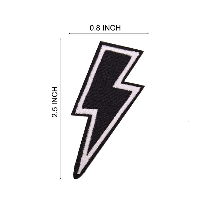 - This set patches all have same size. 3pcs same design and same size iron on patches for clothing means more backup programe when do ironing. Cool black patches are good to cover holes, logo, rips, dirts on black clothes or decorate hats, pants, clothes. Size of the lightning iron patches for vest is 2.5 x 0.8 inch;