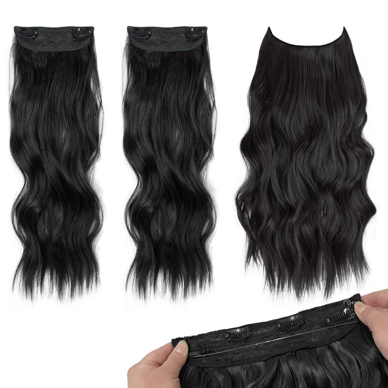 UAmy hair Black Long Wavy Curly Hair Invisible Wire Hair Extensions with Adjustable Size and 2 Clips in Hair Extensions 20 Inch Synthetic Hairpieces for Women(Black)