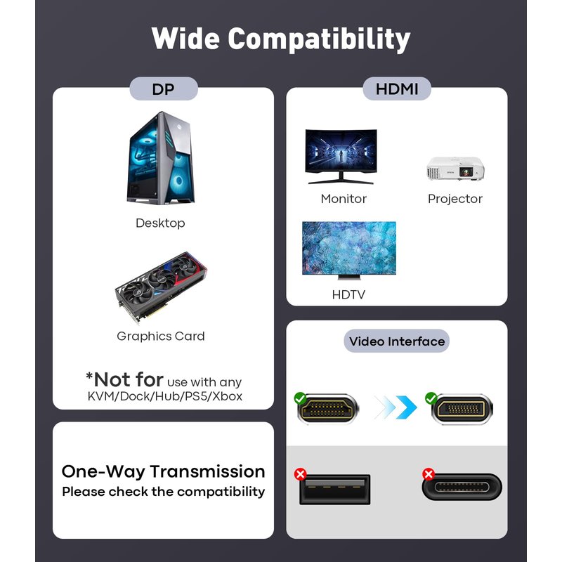 - ðDynamic HDR and HDCP 2.3 Protection: Equipped with Dynamic HDR technology, it enhances colour depth and contrast to present a more lifelike picture; meanwhile, it supports the latest version of HDCP 2.3 protection protocol to seamlessly playback 4K/8K content on all platforms to avoid flickering and black screen problems. ð¢Note: Unidirectional. Only support from DP source device to HDMI display device - Not compatible with PS5,Xbox etc.