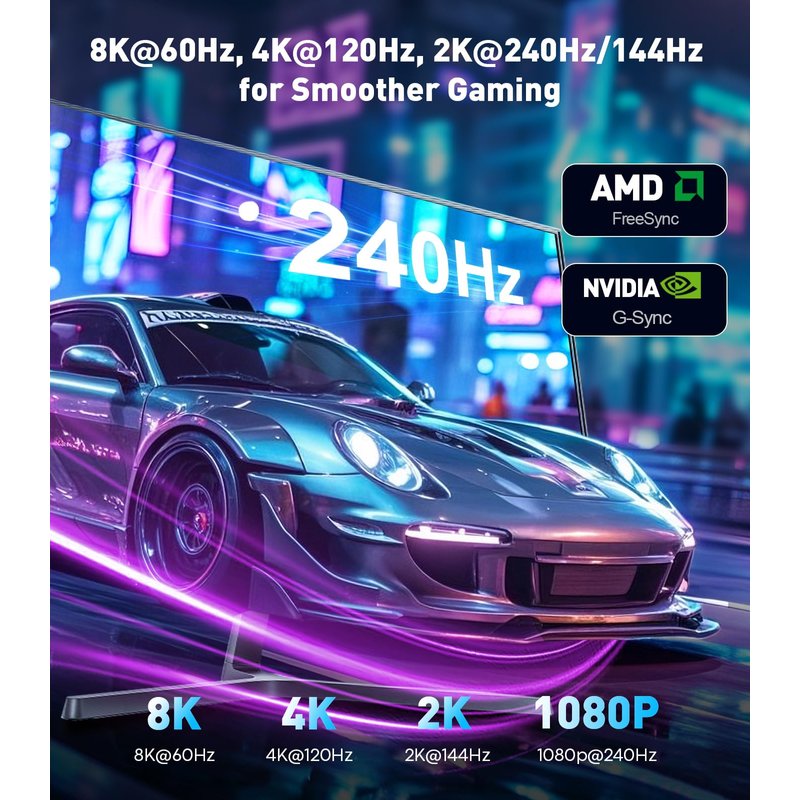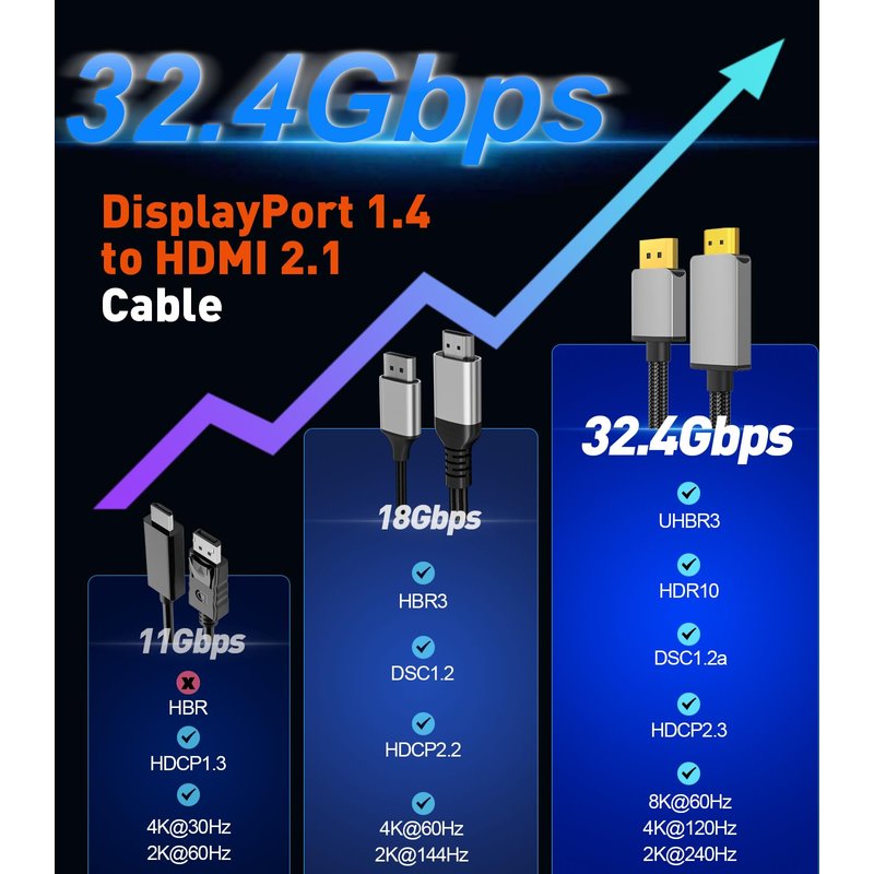 - ð¯Ultra HD Resolution Support: This DisplayPort 1.4 to HDMI 2.1 cable supports 8K@60Hz extreme picture quality output and is backward compatible with 4K@120Hz/60Hz, 2K@240Hz/144Hz/120Hz/60Hz and other high-brush resolutions, which meets the needs of professional gaming, 8K video editing and UHD film and TV. Lossless transmission is achieved through the synergy of DP 1.4's HBR3 bandwidth (32.4Gbps) and HDMI 2.1.