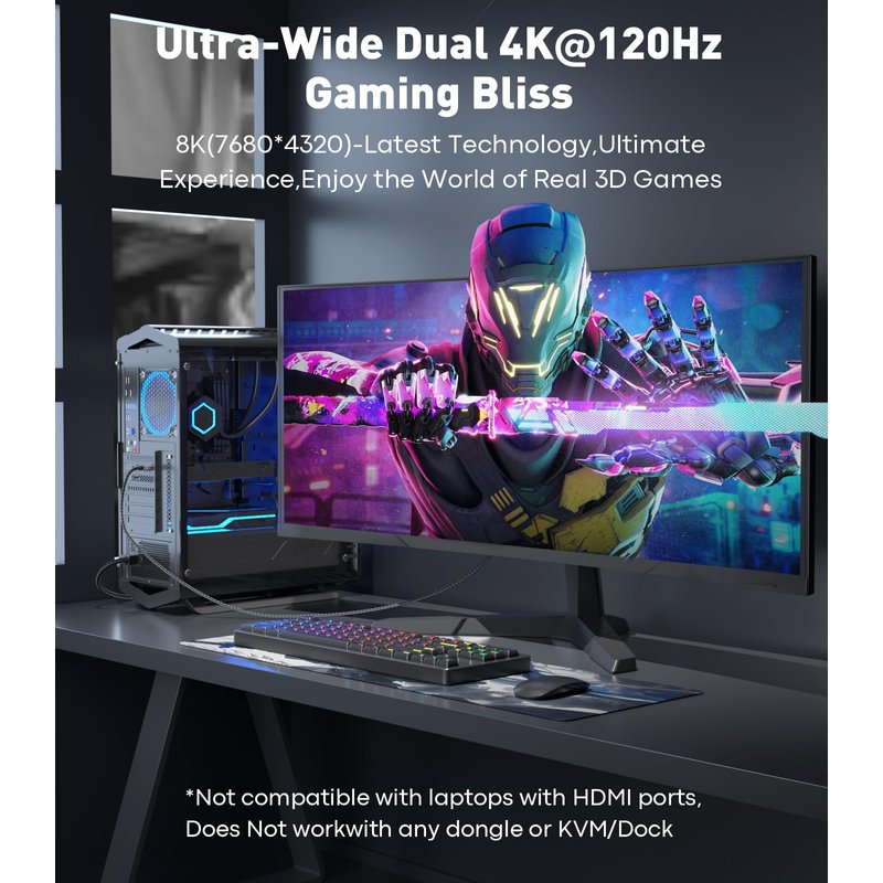 UANTIN Ultra HD Resolution Support: This DisplayPort 1.4 to HDMI 2.1 cable supports 8K@60Hz extreme picture quality output and is backward compatible with 4K@120Hz/60Hz, 2K@240Hz/144Hz/120Hz/60Hz and other high-brush resolutions, which meets the needs of professional gaming, 8K video editing and UHD film and TV. Lossless transmission is achieved through the synergy of DP 1.4's HBR3 bandwidth (32.4Gbps) and HDMI 2.1. Dynamic HDR and HDCP 2.3 Protection: Equipped with Dynamic HDR technology, it enhances colour depth and contrast to present a more lifelike picture; meanwhile, it supports the latest version of HDCP 2.3 protection protocol to seamlessly playback 4K/8K content on all platforms to avoid flickering and black screen problems. ð¢Note: Unidirectional. Only support from DP source device to HDMI display device - Not compatible with PS5,Xbox etc. Military-Grade Durable Design: DP to HDMI 8K Cable adopts a double-layer reinforced structure, with an outer layer of high-density nylon braid winding to resist stretching, and an inner layer of tin foil + tinned copper double shielding layer to effectively reduce signal loss and ensure the stability of high-speed transmission of 32.4Gbps; the thin and lightweight aluminium alloy shell improves heat dissipation and anti-interference. Device Compatibility: Please note - Display Port to HDMI Cable is not compatible with PS5/Xbox/NS/ and laptops with HDMI port. One-way transmission design (DPâHDMI) supports connecting PCs and graphics cards equipped with DP/DP++/DisplayPort ports to HDMI TVs/monitors/projectors. Plug and play without driver