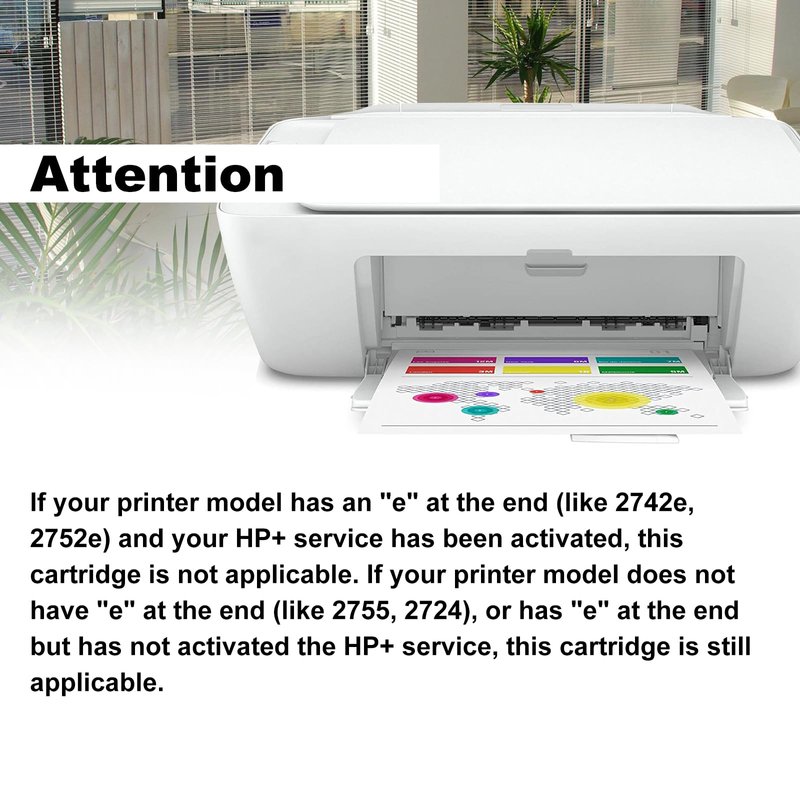 - ⚠️If your printer model has an "e" at the end (like 2742e, 2752e, 6000e) and your HP+ service has been activated, this cartridge is not applicable. If your printer model does NOT have "e" at the end (like 2724, 2755), or has "e" at the end but has NOT activated the HP+ service, this cartridge is still applicable