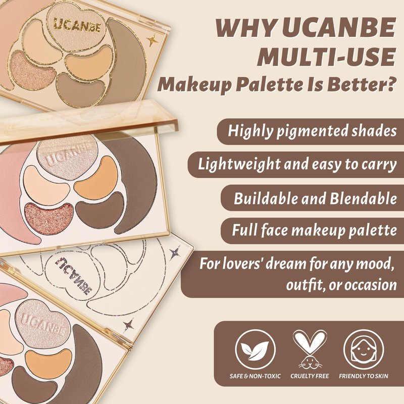 - UCANBE Multi Usage Makeup Palette - Featuring 3 matte and 1 shimmer shades eyshadow + 1 pink blush + 1 heart shape illuminator highlighter + 1 matte bronzer contour to create unique and beautiful face makeup looks from natural looking makeup to smokey eyes looks in one swipe. Create versatile looks with ease, perfect for both makeup beginners and professionals.