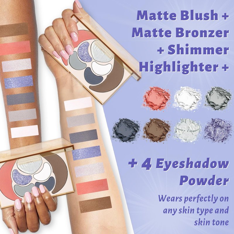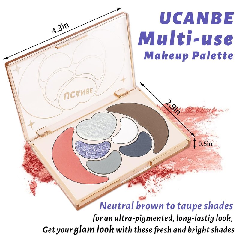 - UCANBE Multi Usage Makeup Palette - Featuring 3 matte and 1 shimmer shades eyshadow + 1 pink blush + 1 heart shape illuminator highlighter + 1 matte bronzer contour to create unique and beautiful face makeup looks from natural looking makeup to smokey eyes looks in one swipe. Create versatile looks with ease, perfect for both makeup beginners and professionals.