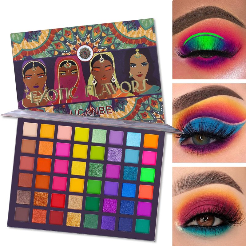- 48 Colors Eyshadow Palette: EXOTIC FLAVORS Eyshadow Palette filled with 48 colorful highly pigmented eye shadow pressed powder,include 24 matte and 6 neon colors + 14 shimmer colors + 4 glitter metallic colors,create different stunning eye makeup looks!
