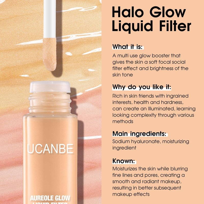 - 【Creates A Glow Radiant Skin】: UCANBE Halo Glow Liquid Filter creates a healthy-looking, more radiant complexion. You can use it directly on your face, or as a highlight after foundation, or as a brightening primer before makeup, or mixed with foundation