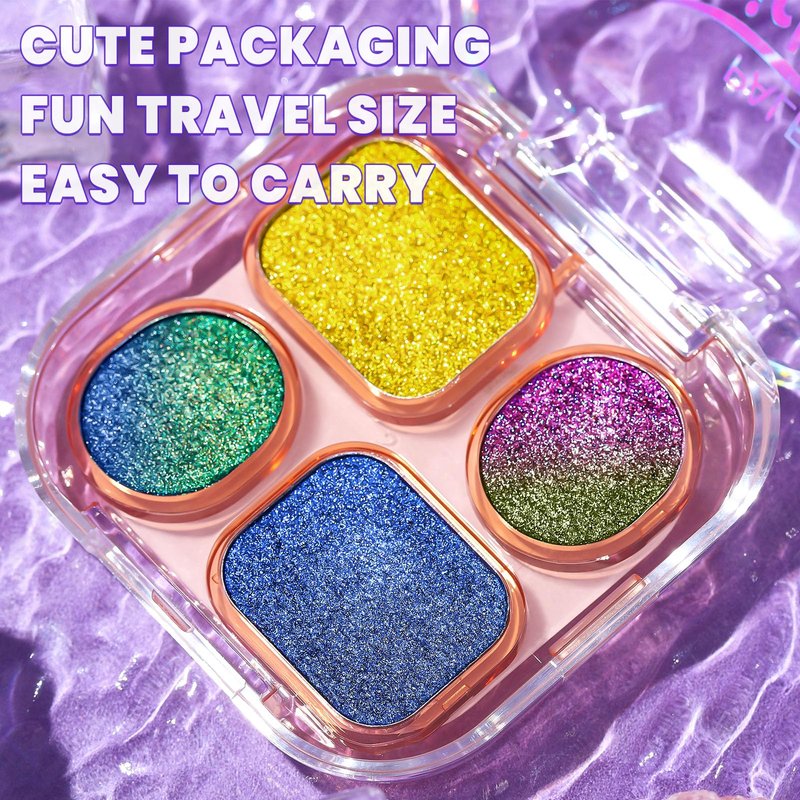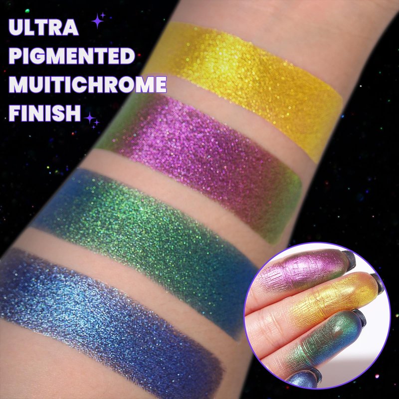 - ULTRA PIGMENTED- Shadow pallet mix of 4 galaxy luminescent colors and rich pressed pigments to feed your makeup obsession. It included glistening gold, purple to olive green, green to blue reflective duo-chrome metallic foils and shimmering ultramarine blue. These color shifts become visible when viewed at different angles on a rounded surface like eyelid in different lighting.