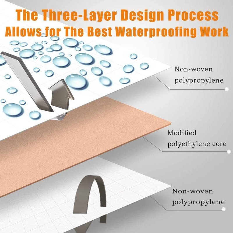 - 【PREMIUM MATERIALS】 Our composite waterproofing band are made of green, new material to ensure the longevity of the membrane. 0.5mm uniform thickness Polypropylene fiber is better than ordinary 0.1mm glass fiber in terms of water resistance and other comprehensive properties. Polyethylene core with anti-aging material has good anti-aging properties to protect your house and money.