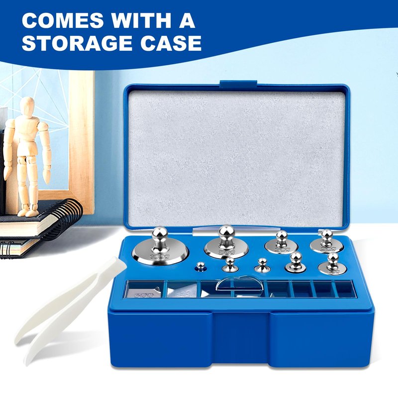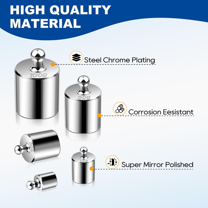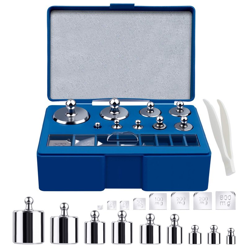 - 17 PCS PRECISION WEIGHTS: This calibration weight set contains 17 pieces of different weights (includes 1x10mg, 2x20mg, 1x50mg, 1x100mg, 2x200mg, 1x500mg, 1x1g, 2x2g, 1x5g, 1x10g, 2x20g, 1x50g, 1x100g) and 1 piece for tweezers.