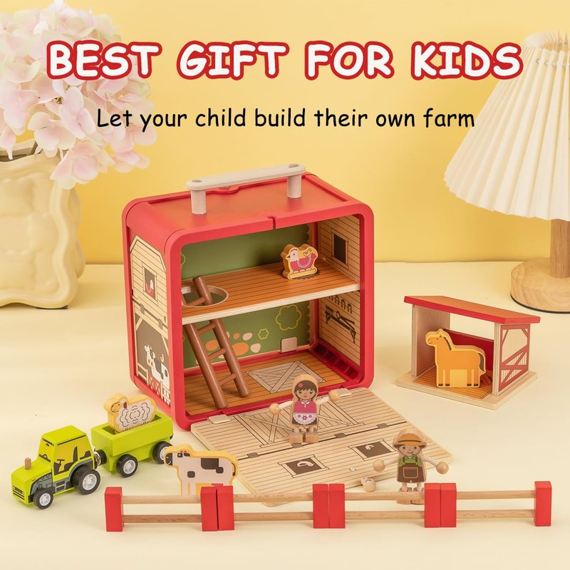 UDEAS Wooden Construction Set Toys Animal Farm Toys with Wooden Figurines Storage Toys for Age 3+ Children