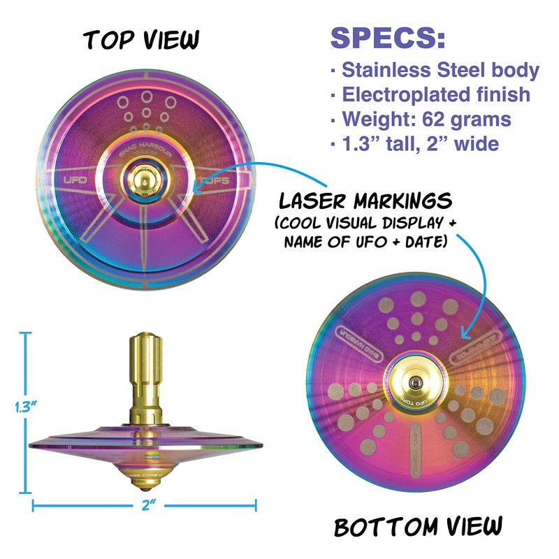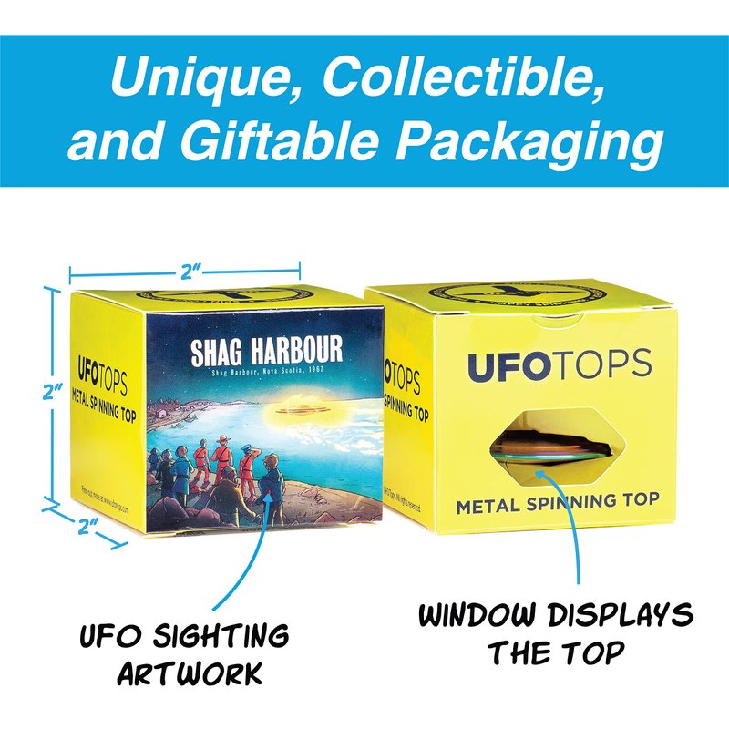 UFO Tops | Shag Harbour | Metal Spinning Top | Inspired by The 1967 Shag Harbour, Nova Scotia UFO Incident | Psychedelic Steel UFO with Solar Yellow Power Core™
