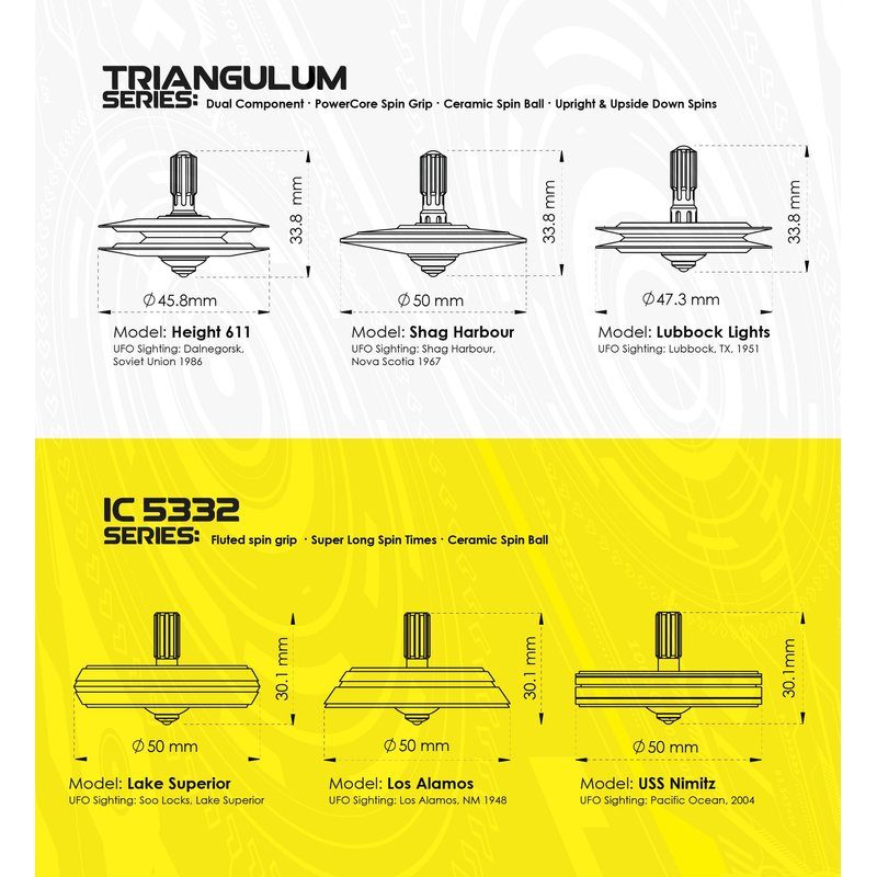 The Shag Harbour UFO Top is a metal spinning top inspired by the 1967 Shag Harbour, Nova Scotia UFO sighting event. Shag Harbour consists of an electroplated stainless steel UFO body and Solar Yellow aluminum Power Core. Shag Harbour is one of three in the Triangulum Series and launched on Kickstarter in the summer of 2021.