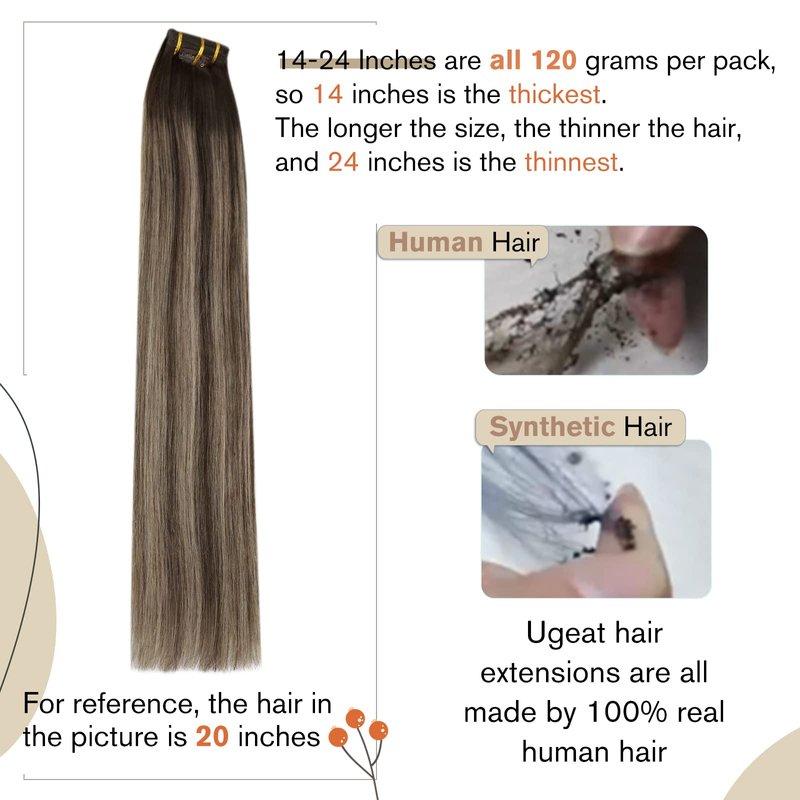 - [ Remy Human Hair ] Ugeat clip in hair extensions boast 9A grade, remy human hair, ensuring a soft, and natural feel. The silky texture mimics your own hair, free from tangling and shedding, and lasts 2-3 months with proper care.