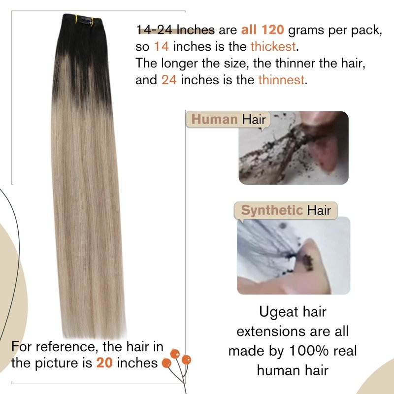 - [ Premium Remy Human Hair Quality Assurance ] Ugeat clip in hair extensions boast 9A grade, remy human hair, ensuring a soft, and natural feel. The silky texture mimics your own hair, free from tangling and shedding, and lasts 2-3 months with proper care.