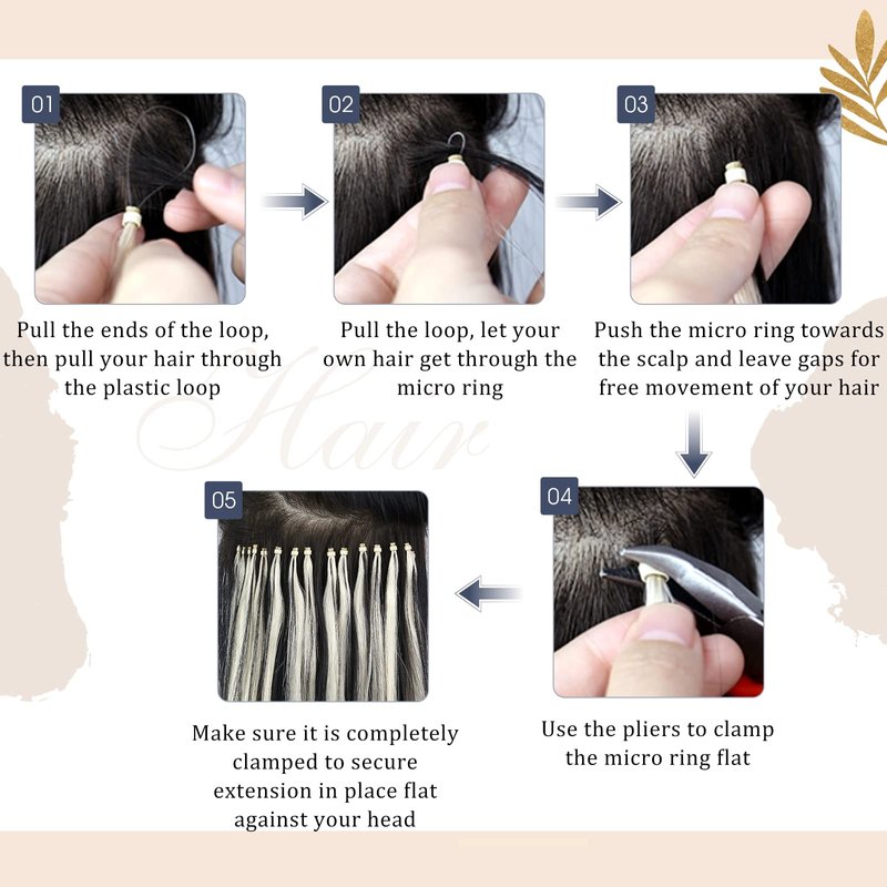 - [ Hair Care Tips for Longevity ] Micro ring hair extensions, unlike natural hair, require special care to maintain their softness, shine, and manageability. Regular use of recommended hair care products and conditioning treatments is essential to ensure the extensions remain in optimal condition. Additionally, tightening the hair with pliers after wearing for a week can significantly prolong their usage time.